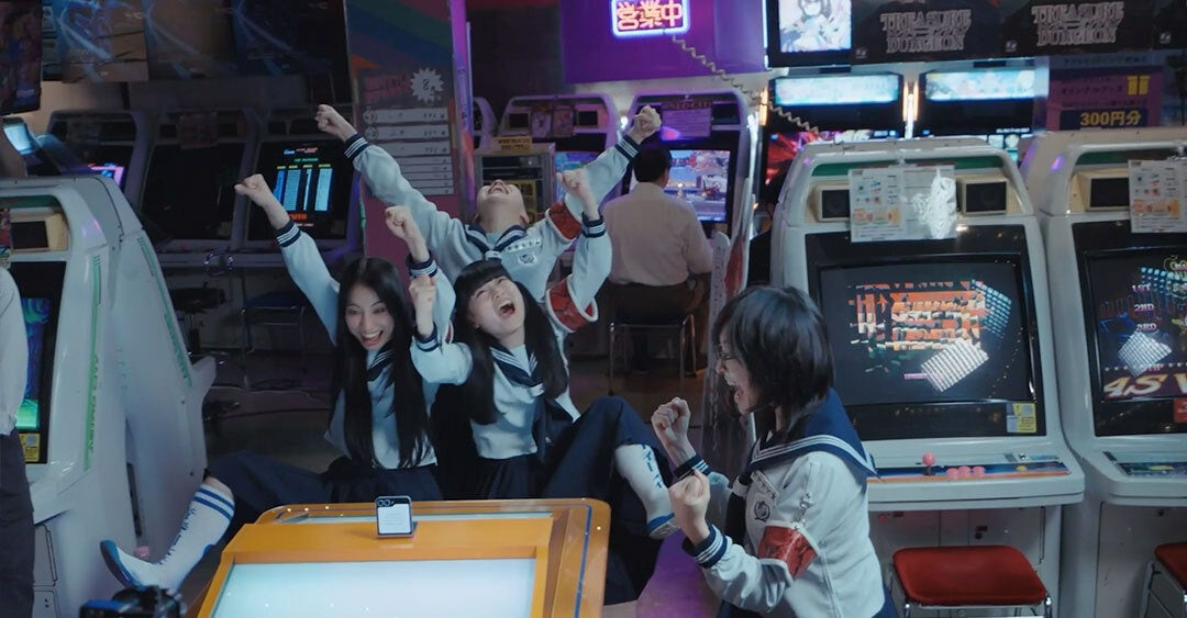 ゲームセンターでゲームをしている観光客、そこに新しい学校のリーダーズが登場し勝負を挑むが、観光客は日本語が分からない様子。そこで「Galaxy Z Flip6」を取り出して「通訳」機能をオン。ゲーム機の上に90度の角度に折りたたんだ状態で端末を置いて日本語で話しかけると、瞬時にGalaxy AIが音声とテキストで外国語に翻訳し、双方向の通訳が可能に。いよいよ勝負がスタート。KANONさんとMIZYUさんがゲームキャラクターとなって戦い見事勝利、観光客が再戦をリクエストするストーリーとなっています。