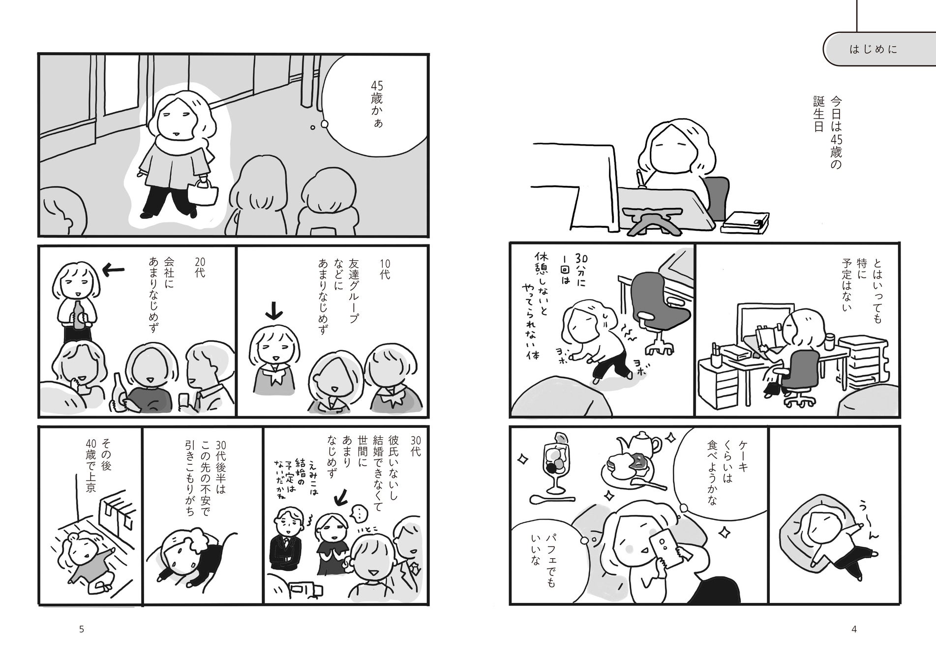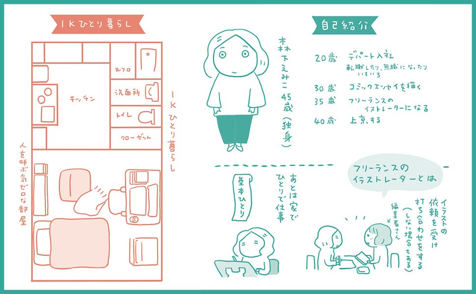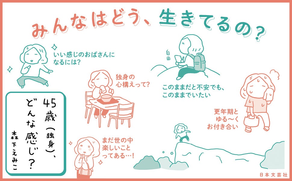 本書は、そんな45歳というターニングポイントを迎えたフリーランスのイラストを職業とする一人の女性「えみこの日常」を通じて、その人生のひとときを疑似体験したり会話しているかのように、森下氏のイラストも楽しめる作品です。