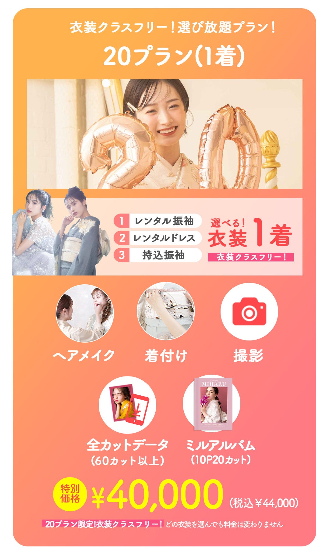 結婚写真、成人記念、振袖レンタルの三つの分野において圧倒的なお得感を感じていただける、「4万円プラン」をご用意しました。
