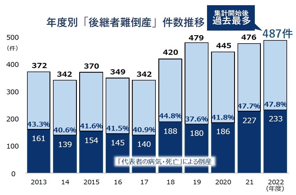 2022年度の後継者不在による「後継者難倒産」は、前年度を2.3%上回る487件発生し、2年連続で増加した。また、これまで過去最多だった19年度(479件)を上回り、最多を更新した。