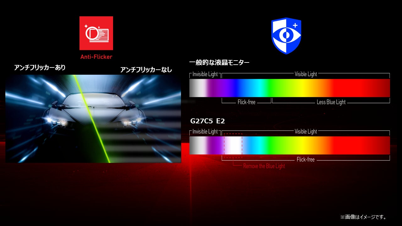 「G27C5 E2」は高い没入感を誇る湾曲率1,500R、細かな文字も見やすい27インチサイズのフルHD解像度(1,920 × 1,080)パネル採用しており、リフレッシュレート170Hz(オーバークロック設定)・応答速度1msの高いスペックで、残像感の少ない映像で快適にゲームプレイを楽しむことが出来ます。また、同期機能としてFreeSync Premium、暗いシーンでも視認性を上げるナイトビジョン、長時間の使用において目の疲労を軽減するアンチフリッカー、ブルーライトカット機能を搭載しております。入力端子はHDMI 1.4b×2、DisplayPort 1.2a ×1に対応しており、パソコンとゲーム機など複数の機器を接続し、背面のジョイスティックを操作することで簡単に切り替えて使用することができます。さらに、VESA規格にも対応しておりモニターアームに取り付け机の上のスペースを有効活用する事が可能です。