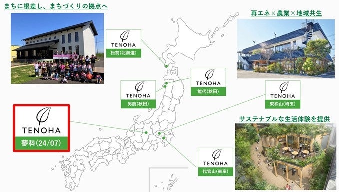 当社は、全国にこれまで 5 か所の「TENOHA」を展開しています。北海道松前町や埼玉県東松山市など再生可能エネルギー事業地を舞台にした施設、東京都渋谷区代官山でサステナブルな生活体験を提供する複合施設「TENOHA代官山」など、都市と地方で、地域の課題解決や活性化につなげていくことを目的とした、事業を通じた地域共生取り組みを行っています。今回の蓼科が 6 か所目となり、当社グループのリゾート事業を通じた、地域とともに環境、自然と共生する施設として誕生しました。各拠点での地域共生の活動とともに、相互連携・共同イベントなどで地域のつながりを創出していきます。