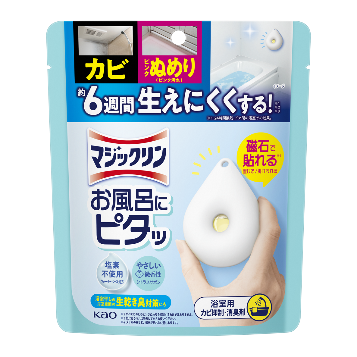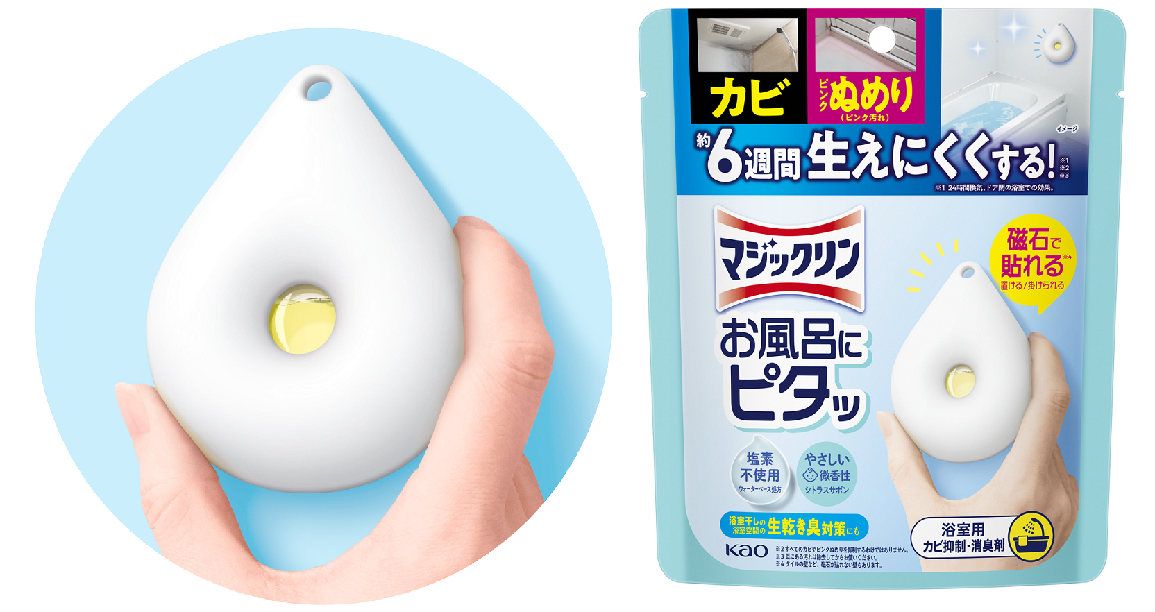 本商品は、浴室の壁に磁石で貼れる*⁵新しいタイプ*¹の浴室用カビ抑制・消臭剤で、手軽に設置できることが特長です。安心して使える処方設計に加え、「くらしへのなじみやすさ」や「続けやすさ」にもこだわりました。