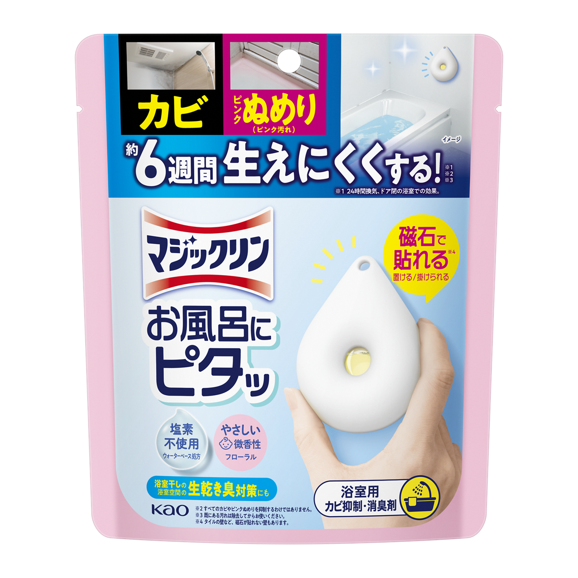 カビ・ピンクぬめりを約6週間生えにくくする*²*³*⁴ 手軽に磁石で壁に貼れる*⁵『マジックリン お風呂にピタッ』発売
