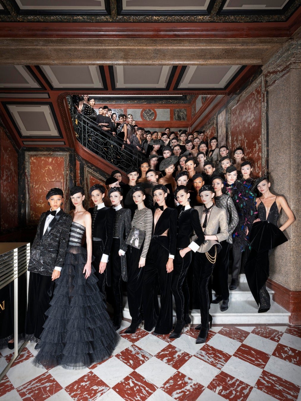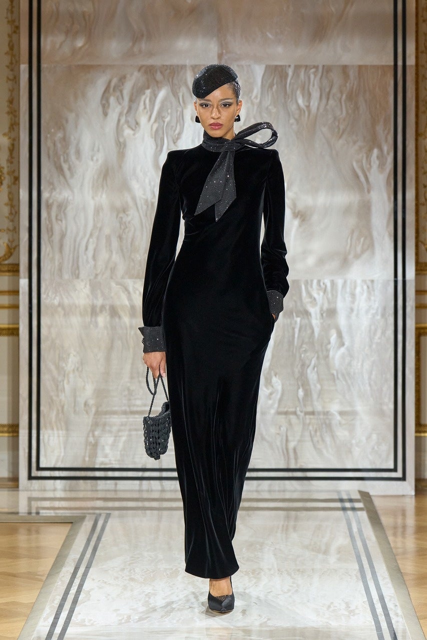 ランウェイは、精密な刺繍が施された流麗なドレスを筆頭に、ブラックの世界へと誘います。再解釈されたタキシードやテイルコート、肌に直接羽織るような構築的なジャケット、ホワイトのシャツにボウタイ、スリムカットのパンツを合わせたブレザーなど、ブラックは多彩な表情を湛えます。