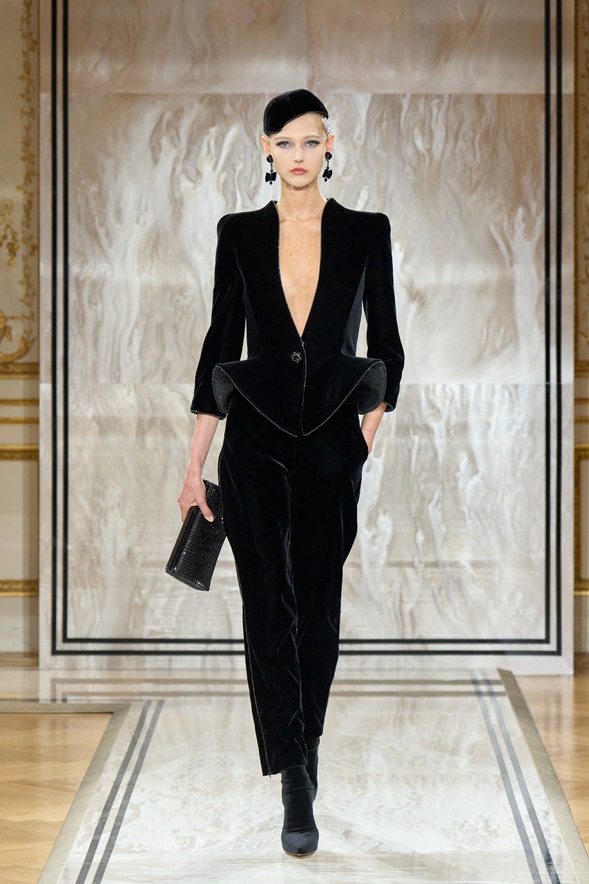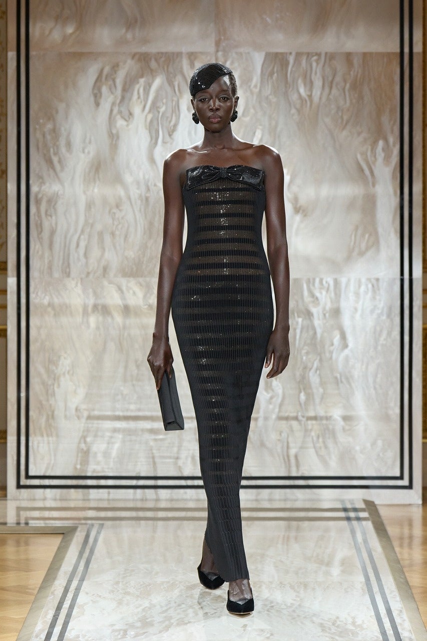 この魅惑的なブラックは、しなやかさと構築性、繊細さと力強さといった対極の要素を美しく調和させながら、アルマーニならではのスタイルの在り方を静かに物語ります。