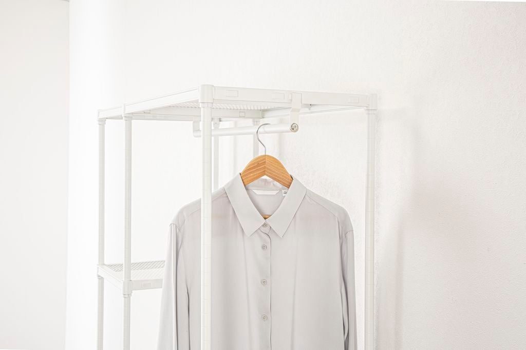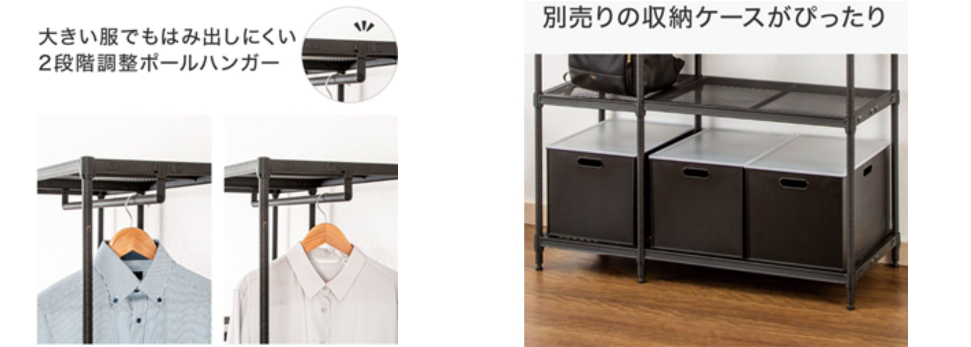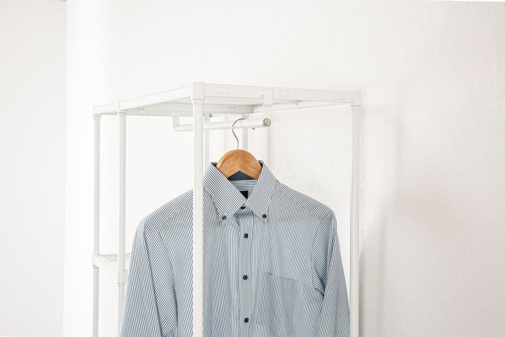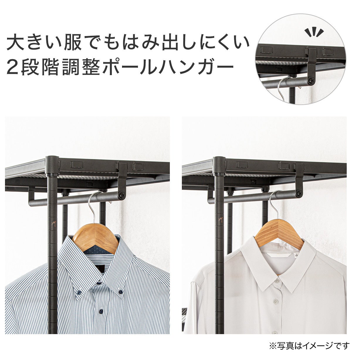 棚板の高さは2.5cm間隔で調整が可能で、カバンや帽子など収納するものに合わせて高さ設定ができます。衣類をかけるポールハンガーも前後に2段階の調節ができるので、洋服幅に合わせてスッキリと収納可能です。