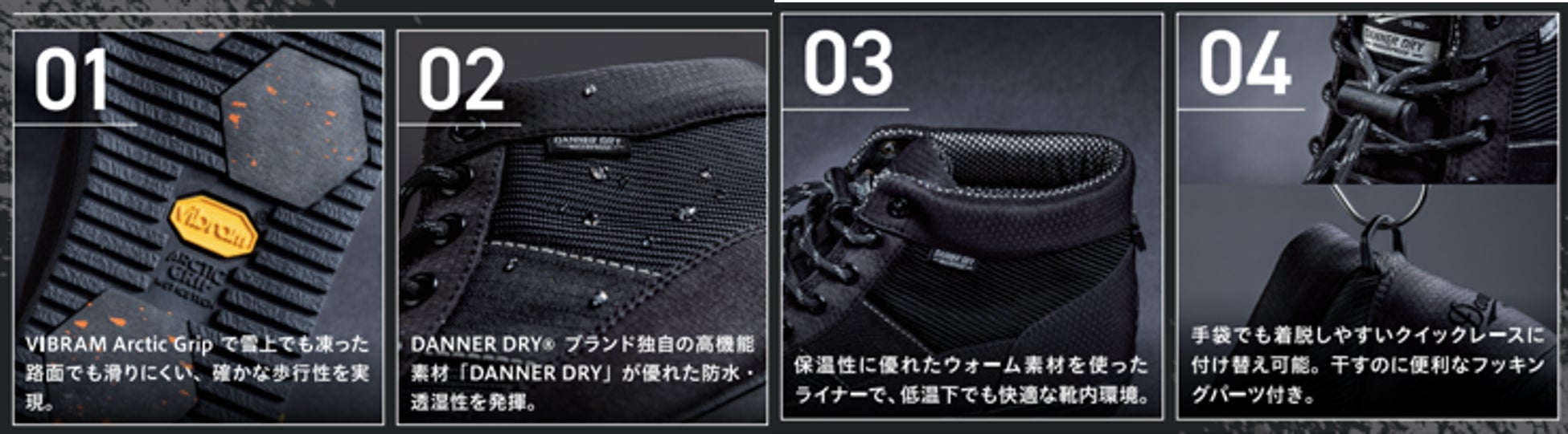 また、靴内部にはDANNERオリジナルの高い防水性を誇る「DANNER DRYメンブレン」を内蔵しています。さらに、ライニングには保温性に優れたウォーム素材を組み合わせる事で、低温下でも快適な靴内環境を実現しています。
