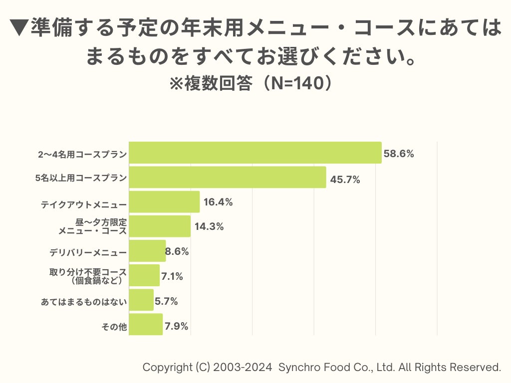 上記で「年末特別メニュー・コースプランの用意」と回答した店舗を対象に、準備する予定の年末用メニュー・コースについて聞いたところ、「2~4名用コースプラン」が最多で58.6%、次に「5名以上用コースプラン(45.7%)」と続くかたちになりました。