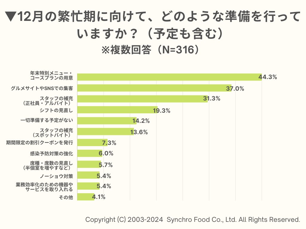 次に、12月の繁忙期に向けてどのような準備を行っているか(もしくは行う予定か)聞いたところ、最も多かったのは「年末特別メニュー・コースプランの用意」で、44.3%。さらに「グルメサイトやSNSでの集客(37.0%)」、「スタッフの補充(正社員・アルバイト)(31.3%)」という結果になりました。