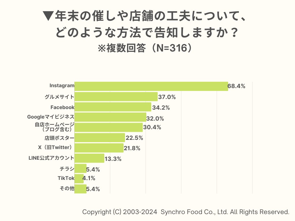 また、年末の催しや店舗の工夫についての告知方法を聞いたところ、やはり「Instagram」が圧倒的多数で68.4%との結果に。次いで「グルメサイト(37.0%)」、「Facebook(34.2%)」、「Googleマイビジネス(32.0%)」となりました。