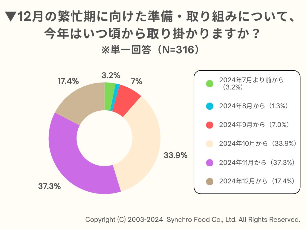 最初に、12月の繁忙期に向けた準備や取り組みについて、取り掛かる時期を聞いたところ、最多は「2024年11月から」(37.3%)という結果に。次いで「2024年10月から(33.9%)」、「2024年12月から(17.4%)」と続き、飲食店の約9割が10月以降に準備を始めていることが分かりました。