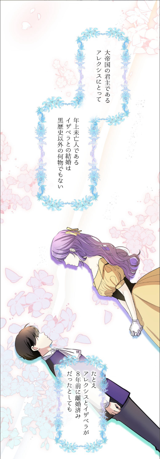 本作品は、お互いを想いながらもすれ違いを繰り返してしまう(元)夫婦による、大人のじれキュンラブストーリー。主人公のイザベラは、前世で愛読していた小説のキャラクター、アレクシスを“闇落ち”から救うため、彼と3年限定の契約結婚を結びます。私生児ゆえに家族から虐げられ、心に深い傷を抱えたアレクシスに、イザベラは惜しみない愛情を注ぎ、次第に二人は「契約関係」を超えてお互いに惹かれあっていきます。しかし、当初の契約通り、イザベラは3年後のアレクシスの成人を機に、ある重大な秘密を抱えたまま、離婚状を置いてひっそりと姿を消します。時が流れ、8年後に運命の再会を果たす二人ですが、アレクシスはなんと冷徹無慈悲な皇帝になっており、さらにイザベラの記憶も失っていました。
