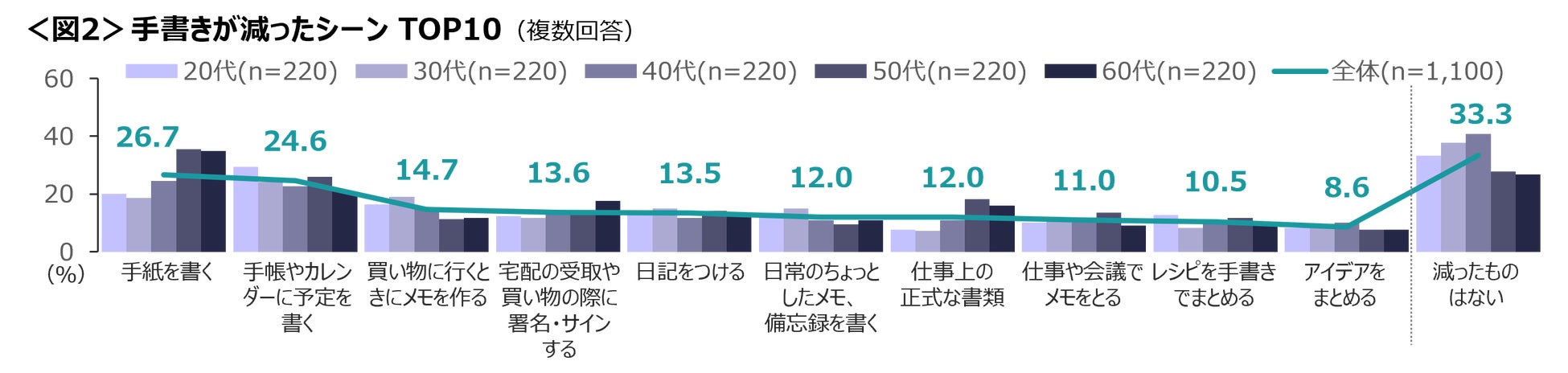 「手紙を書く」は、50~60代で減ったと感じる人が多い。<図2>