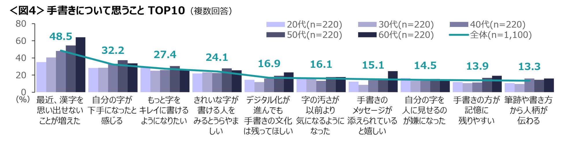 40代以下で高まる「手書きはほとんどしない」 世代共通の悩みは「漢字を思い出せないことが増えた」