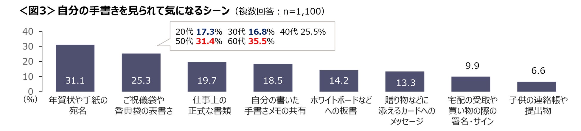 特に「ご祝儀袋や香典袋の表書き」は、年代が上がるにつれて懸念が高まる。<図3>