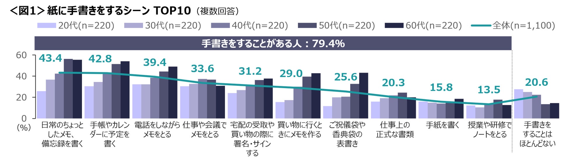 普段、紙に手書きをすることがある人は79.4%。手書きをするシーンは、「日常のちょっとしたメモ、備忘録を書く」「手帳やカレンダーに予定を書く」が4割台。