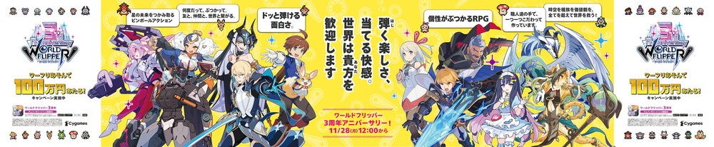 広告には3周年アニバーサリーストーリーイベントに登場するキャラや『ワールドフリッパー』のさまざまなキャラの姿に加えて、今回のキャッチコピー大賞で選出された7点のキャッチコピーが採用されています。