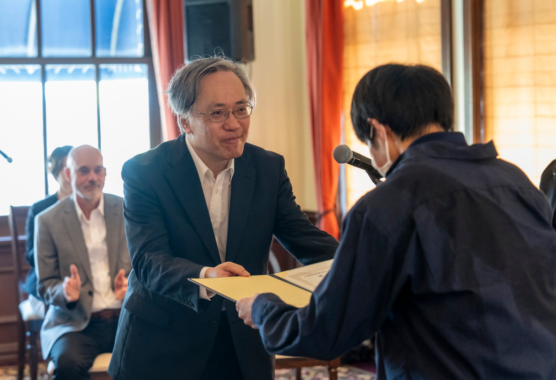 8月21日に開催した認定式では、大阪府育英会 中野伸一(なかの・しんいち)理事長より、夢に向かって頑張る高校生の背中を後押しする言葉とともに、奨学生ひとりひとりに認定証が手渡されました。中野理事長は、「これから社会に出る中で、自らが選択し、決めていく場面が多くなってくると思います。奨学生であることを誇りに思っていただき、社会の役に立つ人材になれるように応援しています。」と激励の言葉を投げかけました。