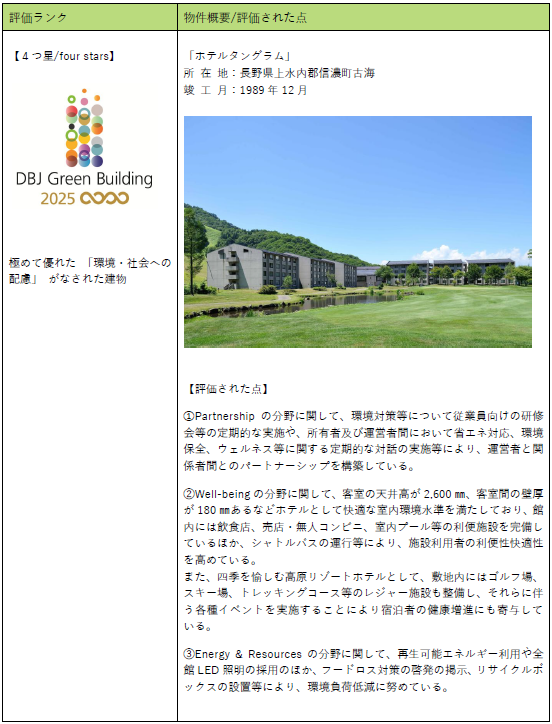 東急不動産株式会社(本社:東京都渋谷区、代表取締役社長:星野 浩明)と東急リゾーツ&ステイ株式会社(本社:東京都渋谷区、代表取締役社長:丹下 慎也、以下「東急リゾーツ&ステイ」)が保有・運営するリゾートホテル「ホテルタングラム」(長野県上水内郡信濃町古海)にて、「DBJ Green Building 認証」(以下、「本認証」)を取得したことをお知らせいたします。