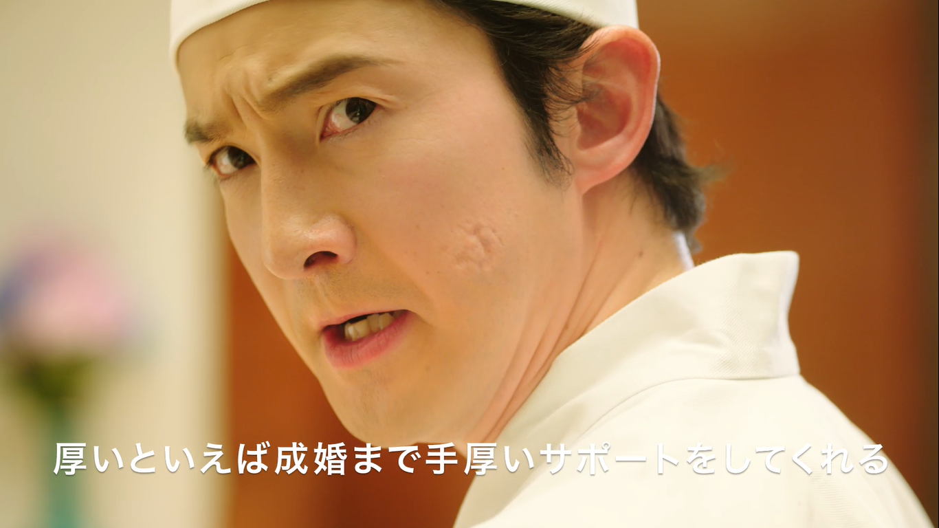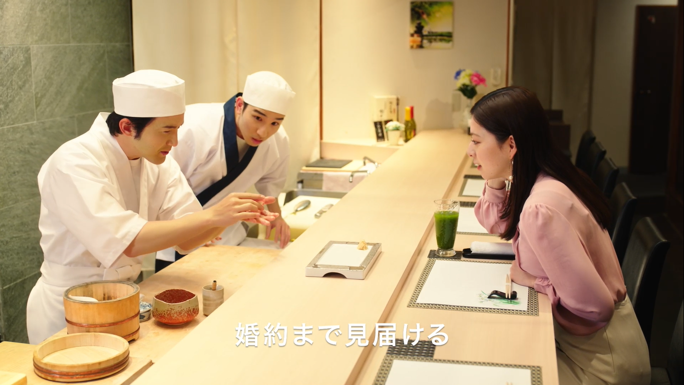 一般的な恋愛では、結婚までに判断を迷うこともありますが、IBJでは1年以内の成婚を実現している方が多く、その理由をCMを通して紐解いていきます*²。浅利陽介さんを中心とするキャスト陣は、舞台を変えてあらゆる役柄になり切りシリーズを展開。第一弾「番組ディレクターとAD篇」第二弾「カメラマンとカメアシ篇」に続く、第三弾「寿司屋の大将と弟子篇」は、大将と弟子が繰り広げる会話劇で、結婚相談所を”寿司”になぞらえ表現していきます。