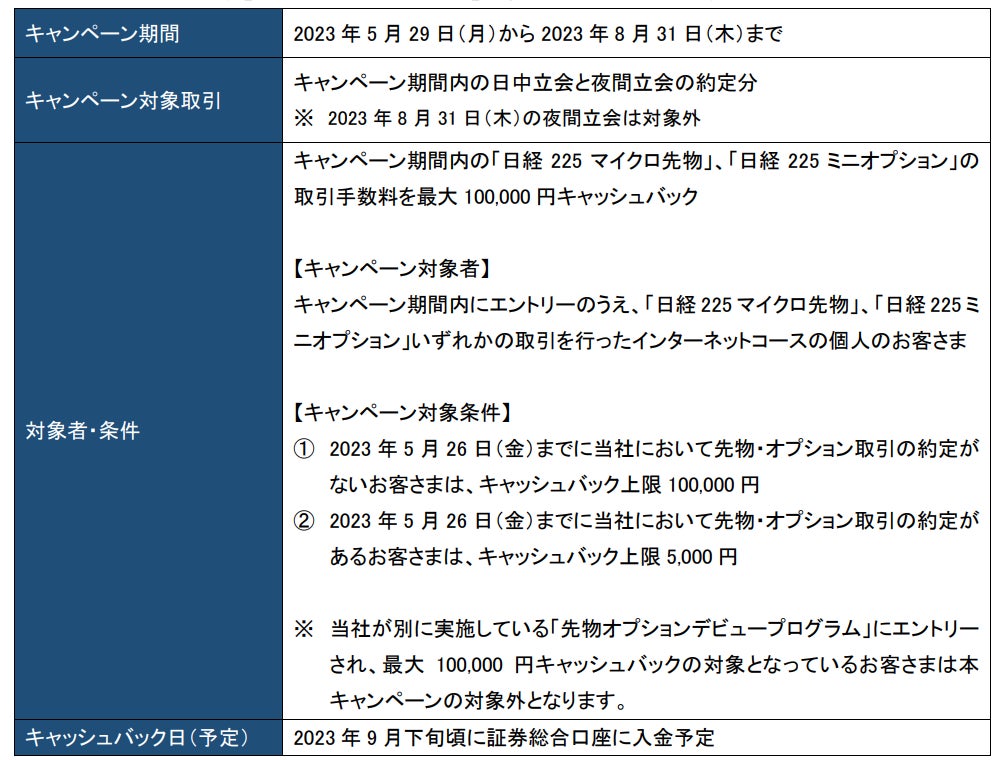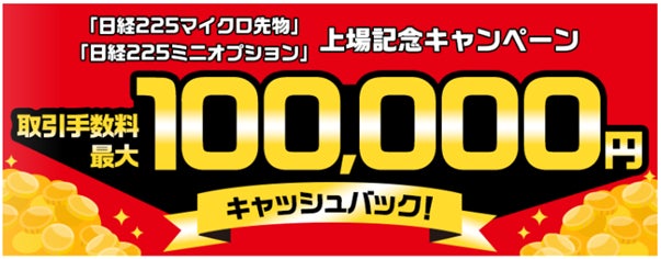 取引手数料を最大100,000円キャッシュバック!「日経225マイクロ先物」「日経225ミニオプション」上場記念キャンペーン実施のお知らせ