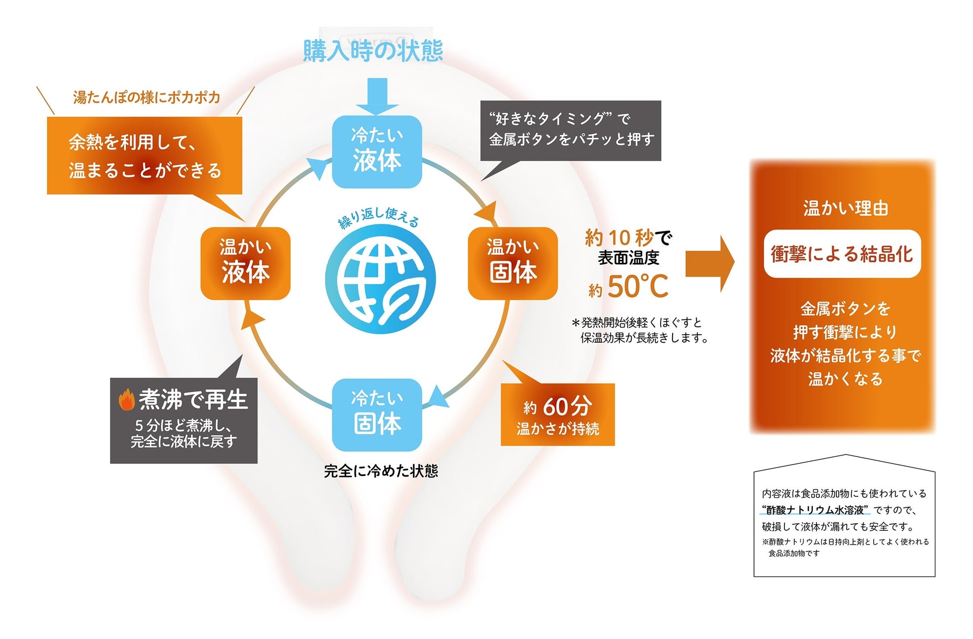 本体内蔵の金属ボタンを押す衝撃により、液体(酢酸ナトリウム水溶液)が結晶化することで温かくなります。約10秒で表面温度が約50℃になり快適温度が約60分持続します。固体化し完全に冷めた後は、5分ほど熱湯で煮沸することで液体に戻ります。そして再び金属ボタンを押し曲げて衝撃を与えると結晶化して温かくなります。