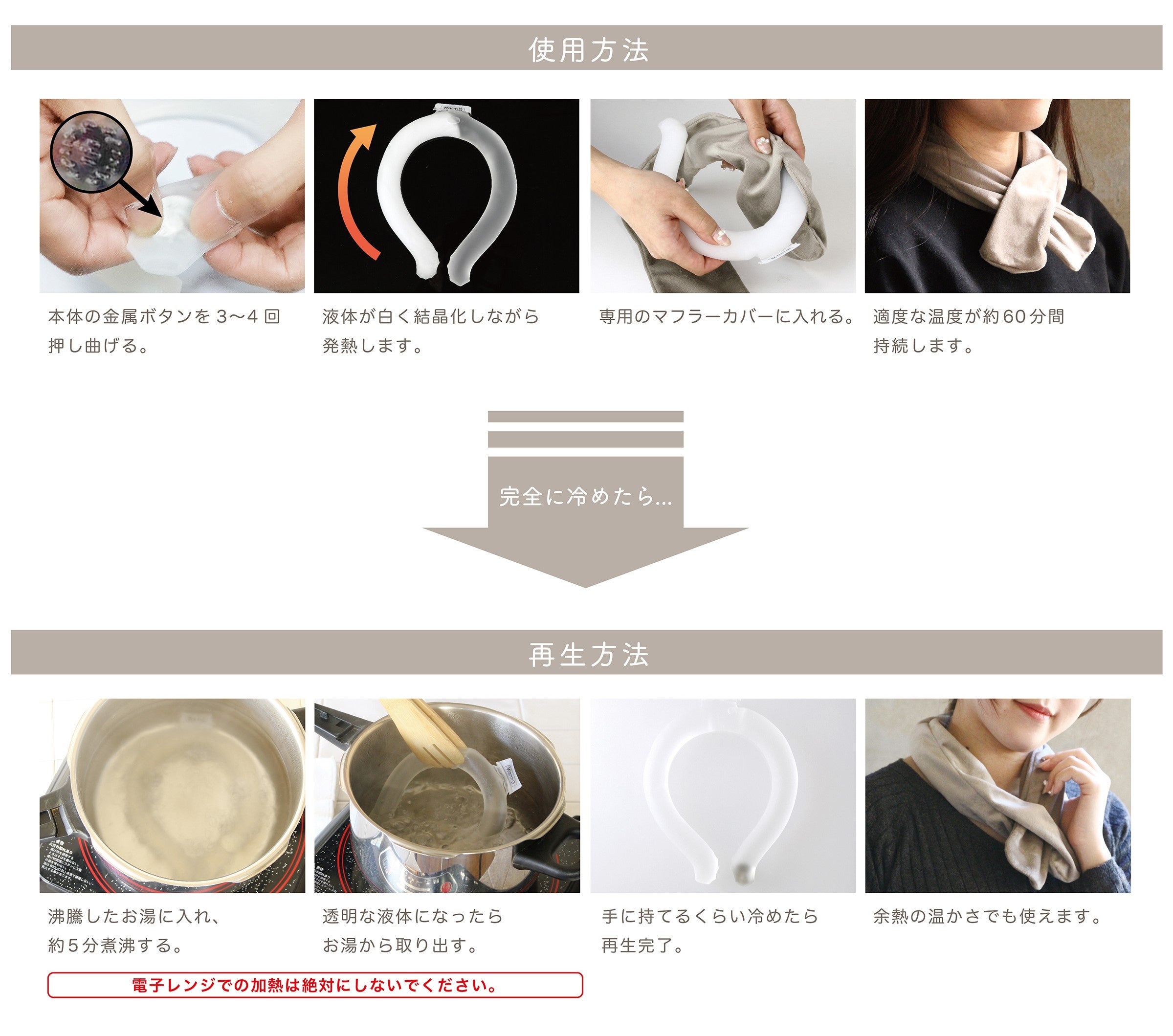 内蔵されている金属ボタンをパチッと押し曲げると、中の液体が白く結晶化(固体化)しながら発熱します。専用のマフラーカバーに入れて使用してください。