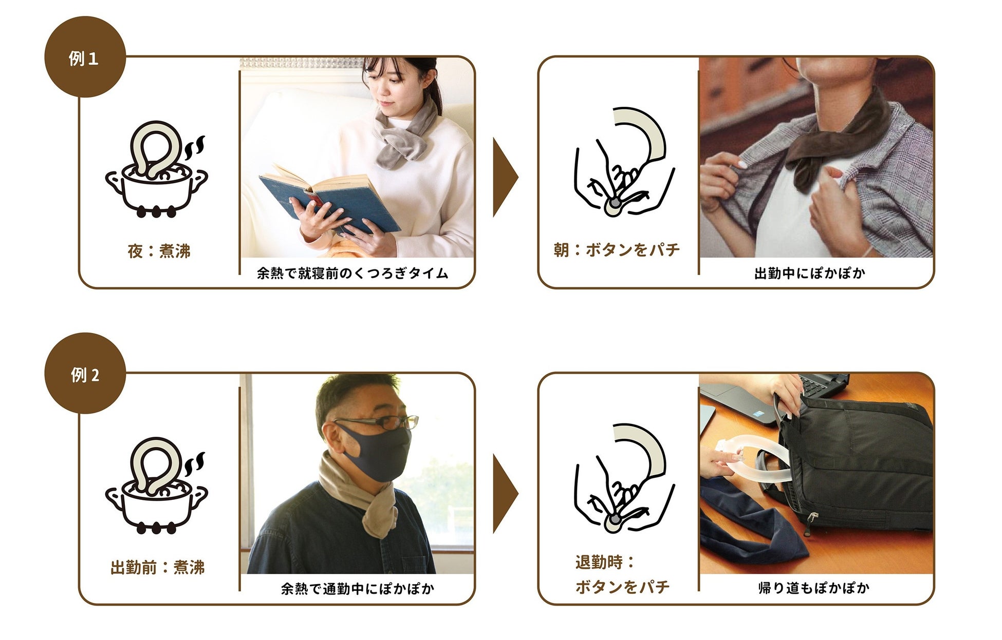 例1:夜の間に「ウォーマーネックリング」を煮沸で再生。その余熱を利用してポカポカくつろぎタイム。翌朝出勤時にボタンをパチッと押して出勤中も温まる。
