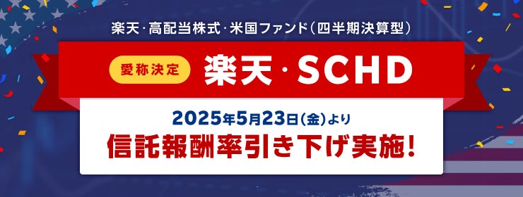 さらに、当該ファンドが、日本の個人でも米国上場ETFである「シュワブ・米国配当株式ETF(Schwab U.S. Dividend Equity ETF、ティッカー・以下「SCHD」)」への投資が可能になる投資信託であることが、よりわかりやすくなるよう、運用管理費用の引き下げ当日より、当該ファンドの名称を、「楽天・シュワブ・高配当株式・米国ファンド(四半期決算型)」に変更します。加えて、より多くの方に親しんでいただける商品となることを目指して、当該ファンドの愛称を「楽天・SCHD」に決定しました。