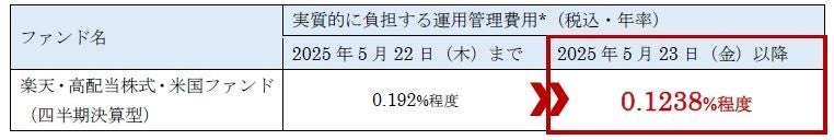 楽天証券株式会社(本社:東京都港区、代表取締役社長:楠 雄治、以下「楽天証券」)と、楽天投信投資顧問株式会社(本社:東京都港区、代表取締役社長:東 眞之、以下「楽天投信投資顧問」)は、2025年5月23日(金)より、楽天投信投資顧問が設定・運用、楽天証券が販売する「楽天・高配当株式・米国ファンド(四半期決算型)」の運用管理費用を、年率0.192%程度(税込)から年率0.1238%程度(税込)に引き下げることをお知らせします。また、当該ファンドの名称を、「楽天・シュワブ・高配当株式・米国ファンド(四半期決算型)」に変更することを、あわせてお知らせします。