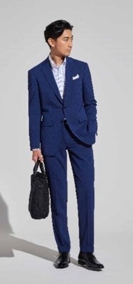 さらに本年は、ジャケットと同じネイビーパンツのほかに、ジャケットとコーディネートしやすいグレーのスペアパンツが付いた「2スタイルツーパンツスーツ」もご用意(5月上旬発売予定)。1着でスーツスタイルとジャケパンスタイルをお楽しみいただけます。
