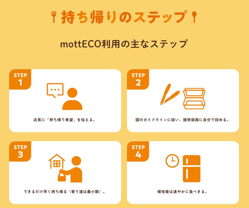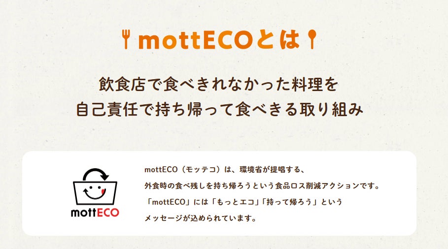 ※3 環境省が、利用者とお店の相互理解のもとで、飲食店等における食べ残しの持ち帰りをより身近な文化として広めることを目的として開催した「NEWドギーバッグアイデアコンテスト」でのネーミングの部で大賞に輝いた作品です。「mottECO(もってこ)」は「もっとエコ」「持って帰ろう」というメッセージが込められています。(参照:環境省 https://www.env.go.jp/press/108796.html)