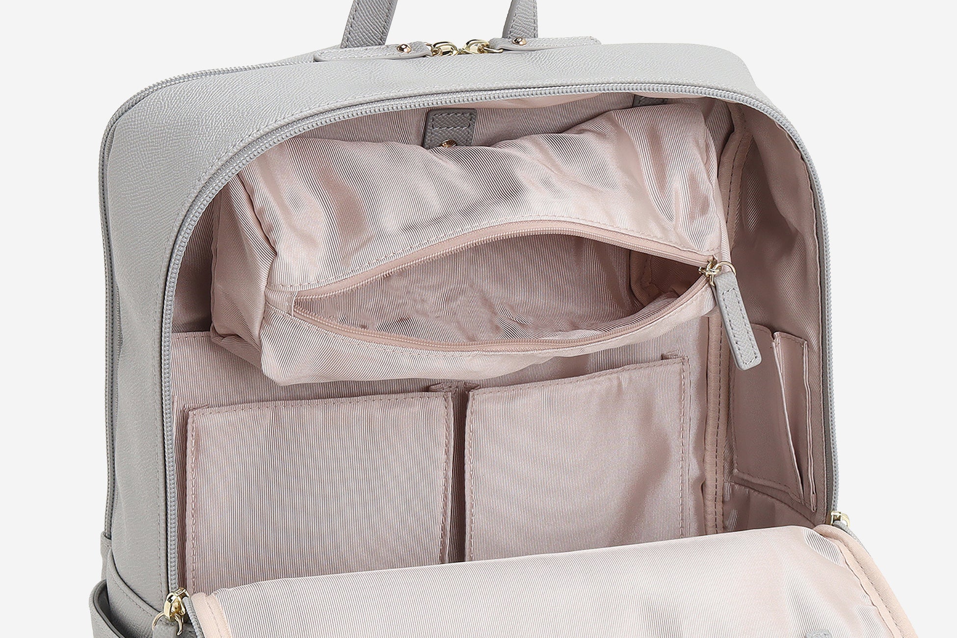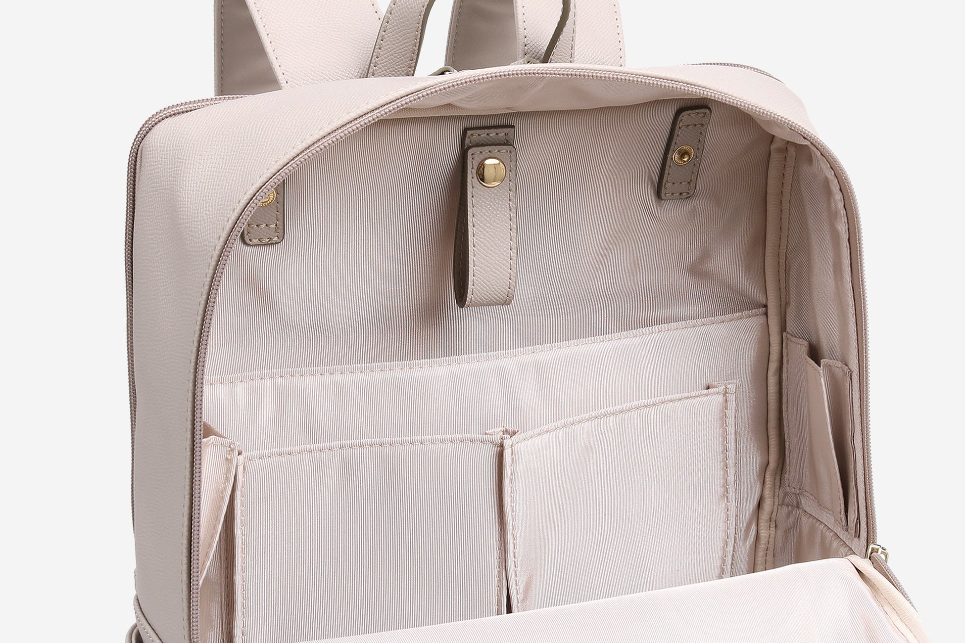 「リモハピ2 リュックサック」には、忙しい毎日に役立つ機能が充実しています。リュック上部のデッドスペースを活用できるポーチ、メイン収納部から独立したPC収納部、さらに小物の整理に便利なポケットを備えており、使い勝手は抜群です。また、ボディにお手入れしやすく傷が目立ちにくい上品な合皮素材を使用しているため、長く綺麗にお使いいただけます。