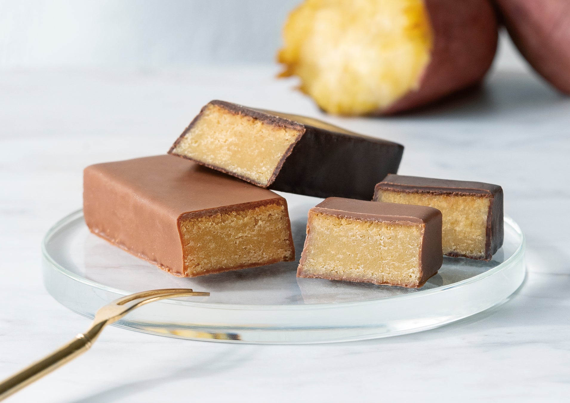 さつまいもブランド「紅天使®」の焼き芋ペーストにバターや生クリームを加えねっとり食感のスイートポテトにし、ベルギー産のカカオ分56%のダークチョコレートをコーティングしました。甘さ控えめの、大人の味わいに仕上げました。