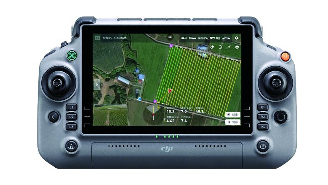 最大7.5メートルの散布幅で効率的に散布作業をおこなうことができ、大容量バッテリーを採用することにより、1回の飛行で約2ヘクタールの散布面積を実現します。高解像度のFPVジンバルカメラを搭載し、圃場の航空測量から農薬等の散布まで、農業機単体で一貫して作業することが可能です。