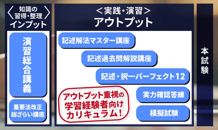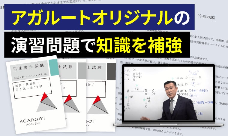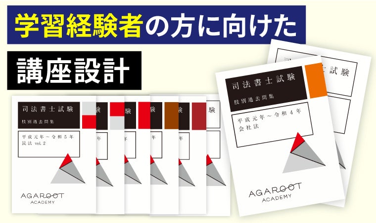学習経験者の方に必要なものは、①知識のメンテナンス・再整理と②良質な問題を用いた反復学習です。アガルートでは、重要頻出事項を中心に講義した演習総合講義、重要法改正総ざらい講座に加えて、5つの問題演習講座をご用意しています。オリジナル問題もご用意していますので、過去問をやりつくした方にもおすすめです。