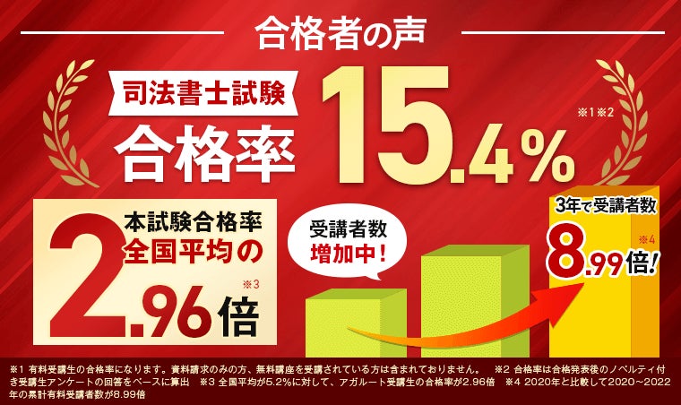 全国平均に比べて「3倍」合格しやすいアガルートの講座。合格特典を目指し、フォロー制度を最大活用しながら、最終合格を勝ち取りましょう!