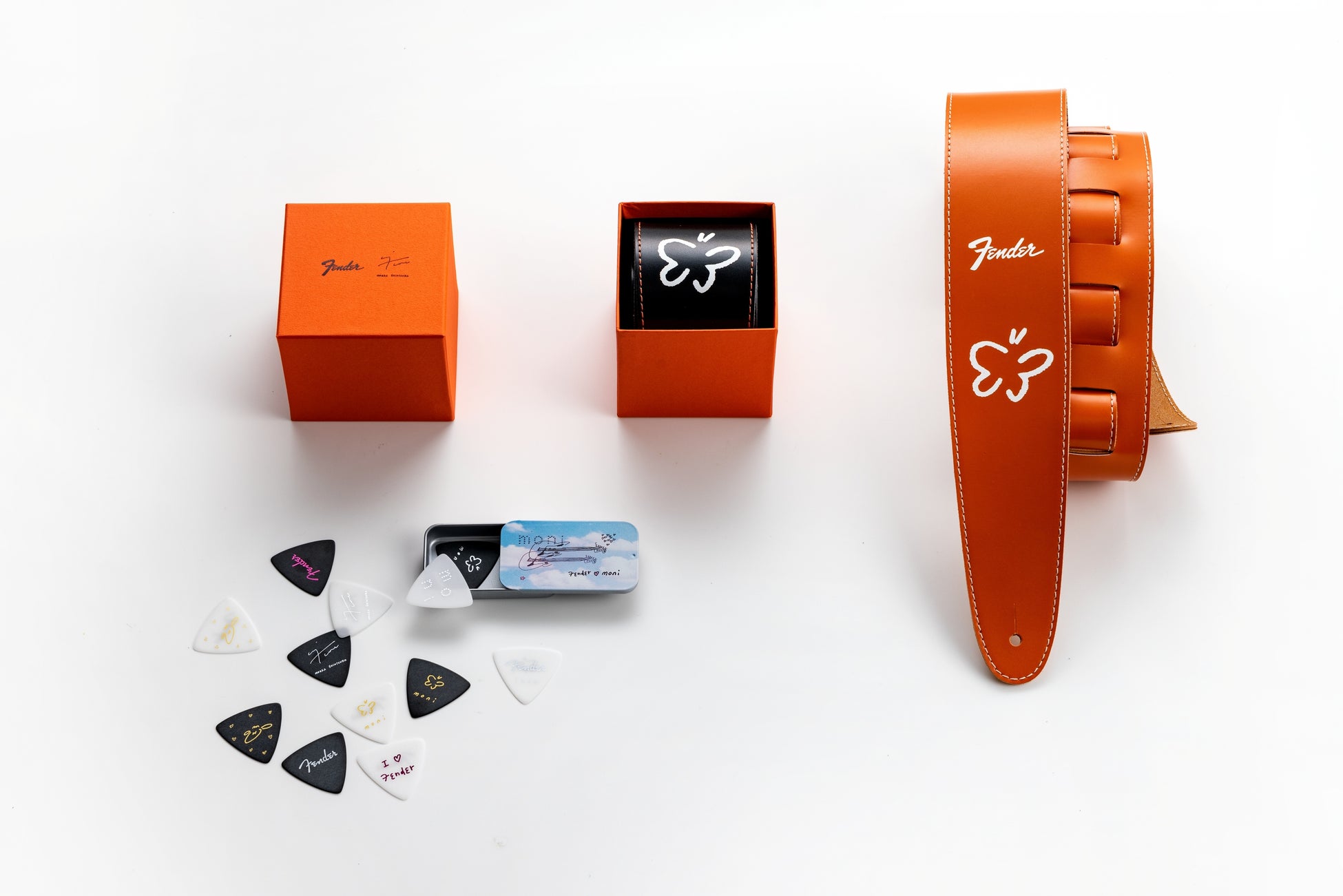 『Fender® x Moeka Shiotsuka Signature Strap』は、日常のリハーサルからライブステージまでを想定し、塩塚本人がデザインしたレザーストラップです。フロントにはフェンダーロゴと蝶のイラスト、背面にはサインの箔押しが刻印された、オリジナルの化粧箱入りの数量限定の特別アイテムです。柔らかく肩に優しい63mm幅で、長時間の演奏でも快適な使用感を実現。ブラックとオレンジの2色展開で、太めのステッチがアクセントになっています。