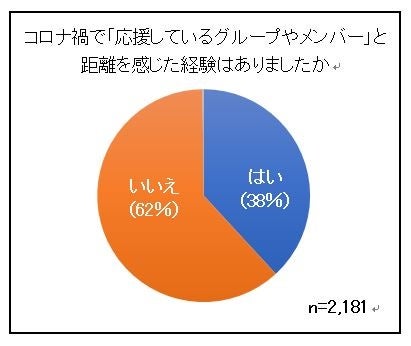 「コロナ禍で「応援しているグループやメンバー」と距離を感じた経験があるか」尋ねると、約4割(38%)の人が「はい」と回答しました。