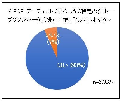そのK-POPファンに、「K-POPアーティストのうち、ある特定のグループやメンバーを応援(=“推し”)しているか」聞いたところ、93%の人が「はい」と回答。K-POPファンの約9割に、いわゆる“推し” といわれる特定の応援対象がいることがわかりました。