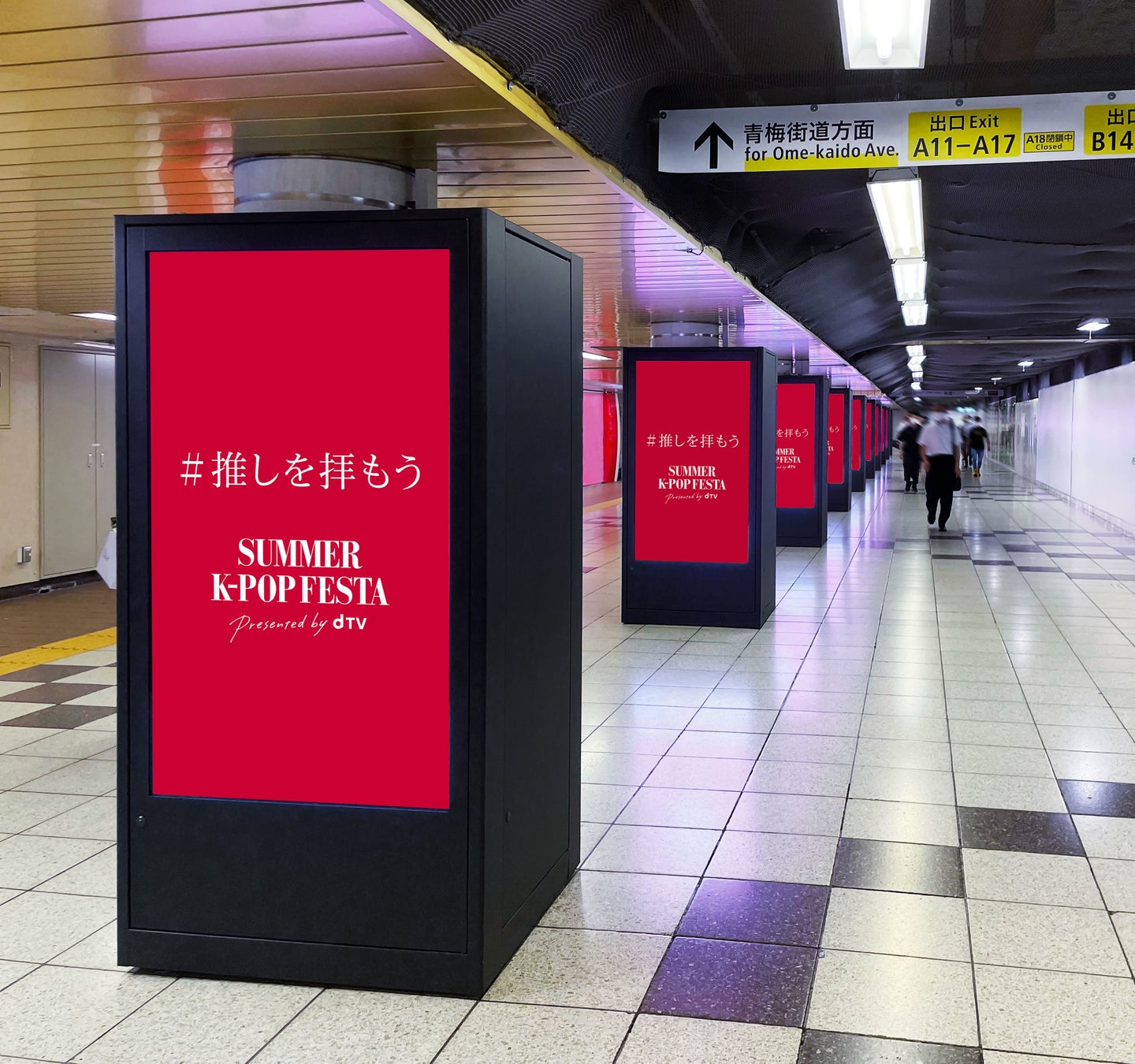 「dTV®」は、人気アーティストのライブ映像やミュージックビデオなど多様な音楽コンテンツのご提供を行っている音楽ライブ作品数No.1※の映像配信サービスです。この度、dTVでは、新宿駅地下1階の「東京メトロ/Metro Concourse Vision (MCV)新宿駅定期券うりば前・新宿駅メトロプロムナード」にて、2022年8月22日(月)より「#推しを拝もう」をコンセプトに人気K-POPアーティスト総勢100名超のライブパフォーマンスを鑑賞することができる交通広告の掲出を開始します。