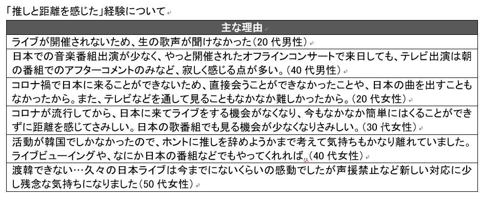 その理由を聞くと、「推しの活動が韓国でしかなかった」(40代女性)、「日本の歌番組でも見る機会が少なくなりさみしい」(30代女性)、「ライブが開催されないため、推しの生の歌声が聞けなかった」(20代男性)という声があがり、公演や渡航の制限が日本のK-POPファンの“推し活”に影響しており、リアル開催のライブを見る機会があっても「声援禁止など新しい対応に少し残念な気持ちになりました」(50代女性)という声もあり、主にコロナ対策で物理的な制限があるために距離を感じているようでした。