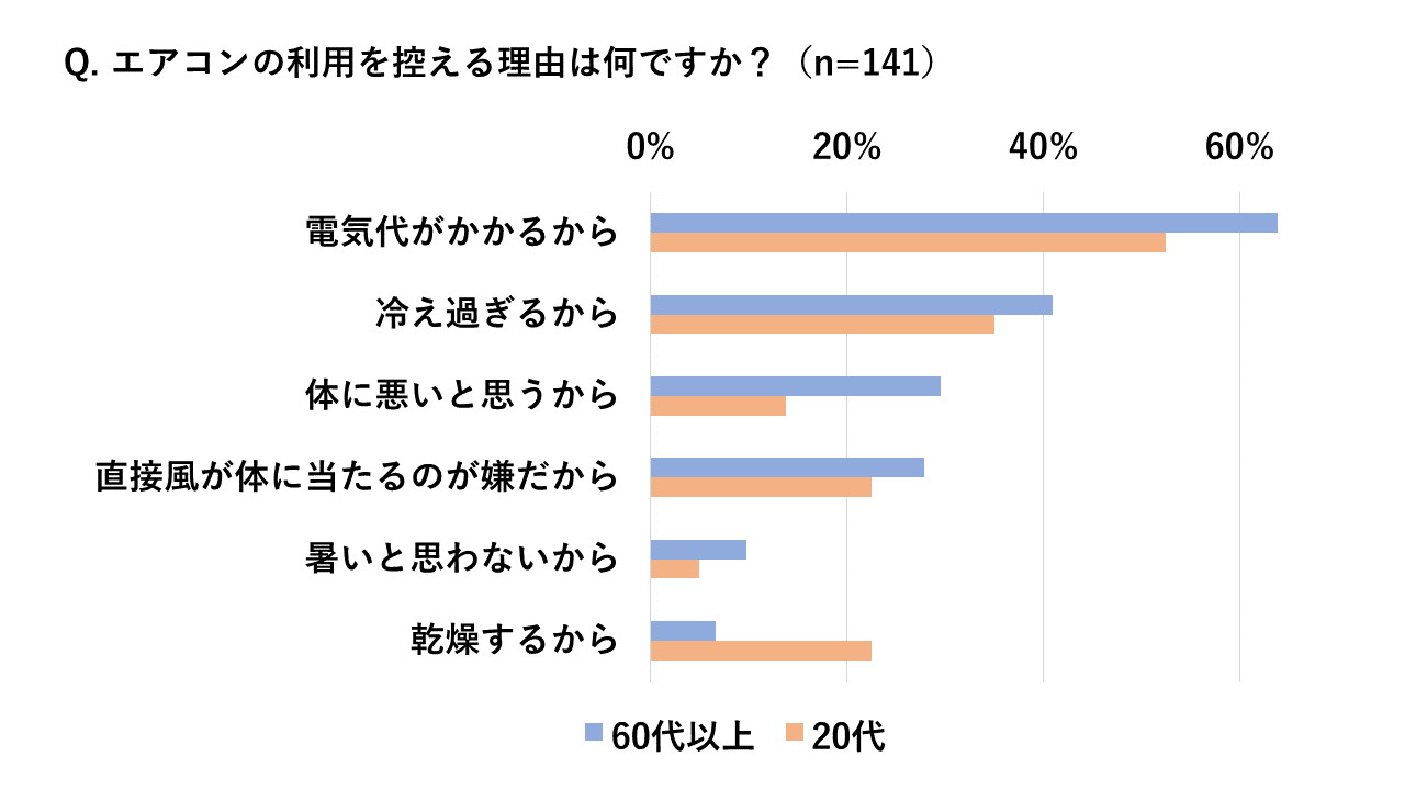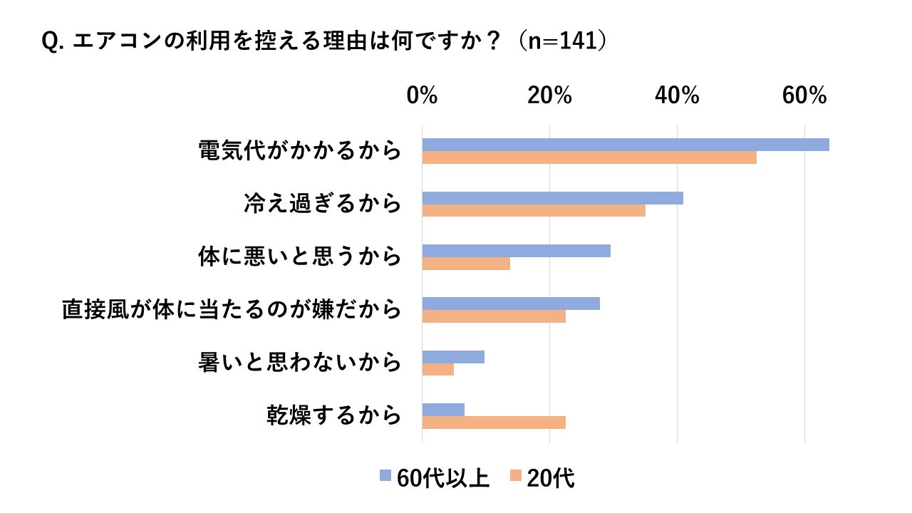 続いて、通常時エアコンガマン・使わない派に、エアコンの利用を控える理由をたずねたところ、全世代で最も多い回答が「電気代がかかるから」でした。さらに、60代以上の回答に注目すると、「冷えすぎるから」(41%)、「体に悪いと思うから」(30%)、「直接風が体に当たるのが嫌だから」(28%)と続きます。60代以上の特徴として、「体に悪いと思うから」・「暑いと思わないから」という回答が、20代に比べると多い点が挙げられます。