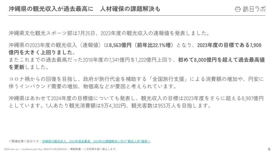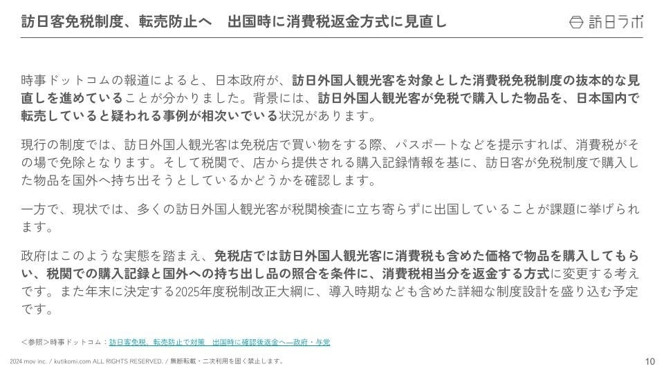 ほかにも「沖縄県の観光収入が過去最高に 人材確保の課題解決も」「訪日客免税制度、転売防止へ 出国時に消費税返金方式に見直し」など インバウンド担当者必見の情報を1本のレポートに凝縮!