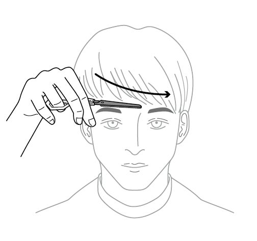 上(毛量の多い)の部分を真上に引き出してねじります。前髪と顔まわりの1~2cmはあまり切らないようにします。1回切ったら髪の毛を落とし、バランスを整えましょう。