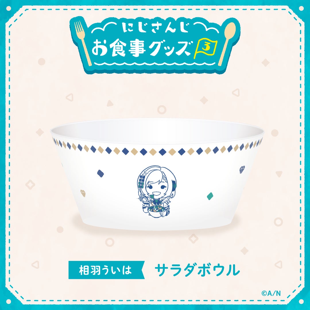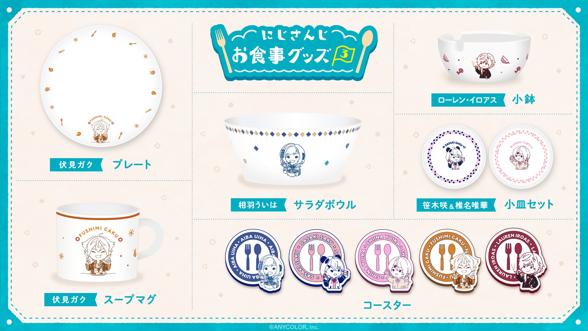 「にじさんじお食事グッズ3」のラインナップは、プレート(伏見ガク)、サラダボウル(相羽ういは)、小皿セット(笹木咲、椎名唯華)、スープマグ(伏見ガク)、小鉢(ローレン・イロアス)、コースター(相羽ういは、笹木咲、椎名唯華、伏見ガク、ローレン・イロアス)の計6種類。
