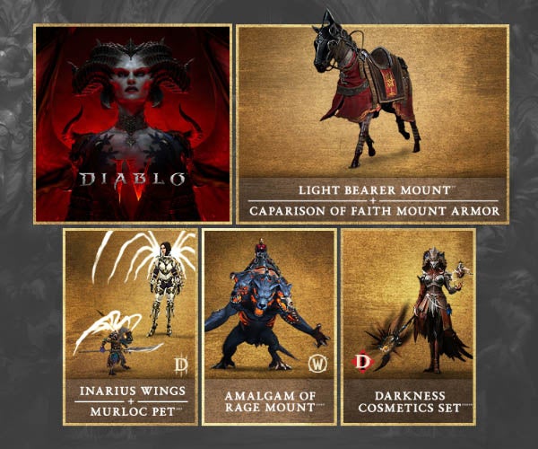 『ディアブロ IV』 GeForce RTX 40 シリーズバンドルでは、ディアブロ IV スタンダード・エディションに加えて、乗騎「光の使者」及び乗騎の鎧「信仰の飾り馬衣」、「Diablo III」向けの「イナリウスの翼」とペット「マーロックのイナリウス」、「World of Warcraft」向けの乗騎「Amalgam of Rage」、「ディアブロ イモータル」向けのコスメティックセット「有翼の闇 赤褐色」が手に入ります。