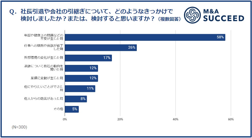 承継について考えるきっかけは、約6割が「年齢や健康上の問題が生じた時」と回答