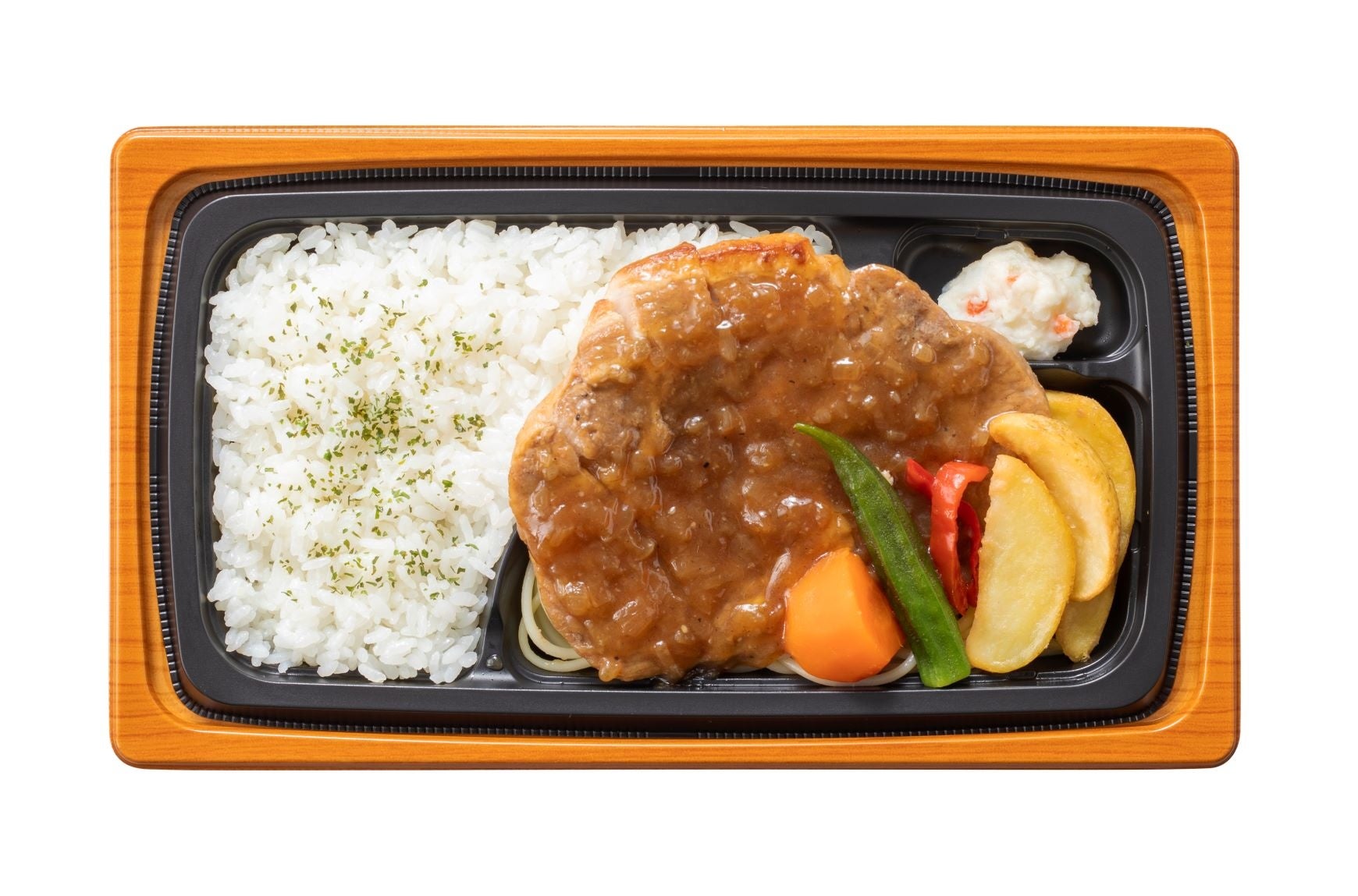 このたび、ソースのリニューアルや、新メニューを加え、「【新】肉弁当 四天王」として、「肉汁じゅわっと!鉄板焼ハンバーグ弁当」(税込638円)、「香味野菜香る!特製だれの油淋鶏&炒飯弁当」(税込638円)、「赤ワイン仕立てのオニオンソース ポークソテー弁当」(税込648円)、「肉の旨みとやわらか食感!特製とんかつ弁当」(税込648円)の4種類を発売いたします。